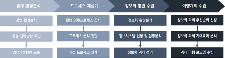 BPR(Business Process Reengineering)은 현행 업무의 비즈니스에서 일어나는 모든 처리과정을 효율성, 품질, 경영전략 등의 측면에서 검토하여 업무프로세스를 재설계하고, 이에 필요한 정보화 과제 정의 및 이행계획을 수립하여 업무효율을 극대화하는 서비스입니다.